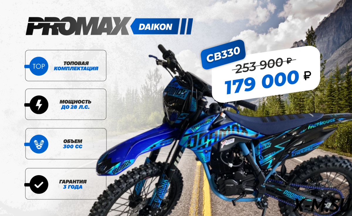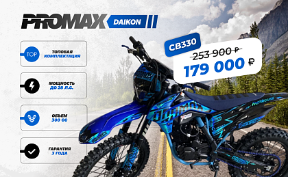 Дополнительная информацияЦена на товар Кроссовый мотоцикл PROMAX DAIKON CB330 не является итоговой и может измениться в зависимости от валютных курсов, общей экономической ситуации или логистических и иных факторов.